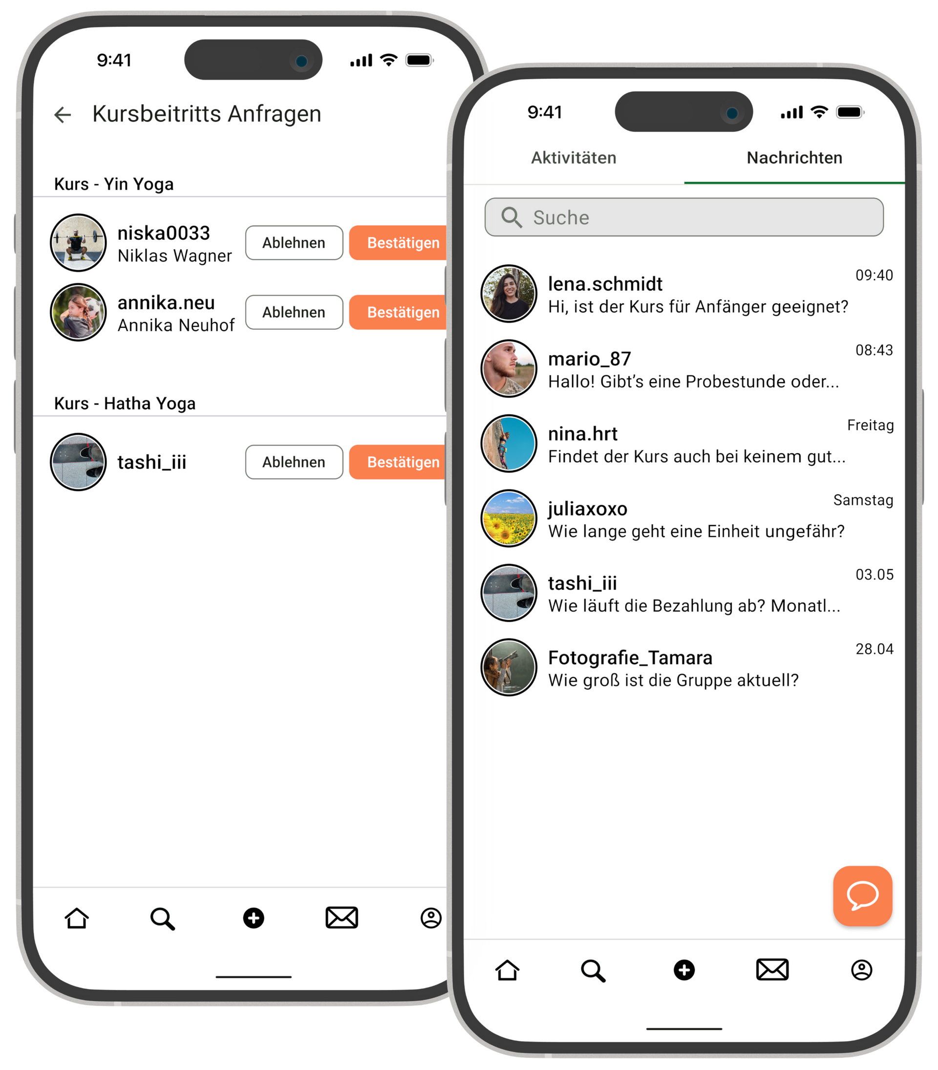 Interessenten schreiben dich in der App an und können eine Anfrage stellen, deinem Kurs beizutreten. Sobald du die Anfrage bestätigst, werden sie zu Kursmitgliedern und können sich anschließend zu deinen Kursterminen anmelden.